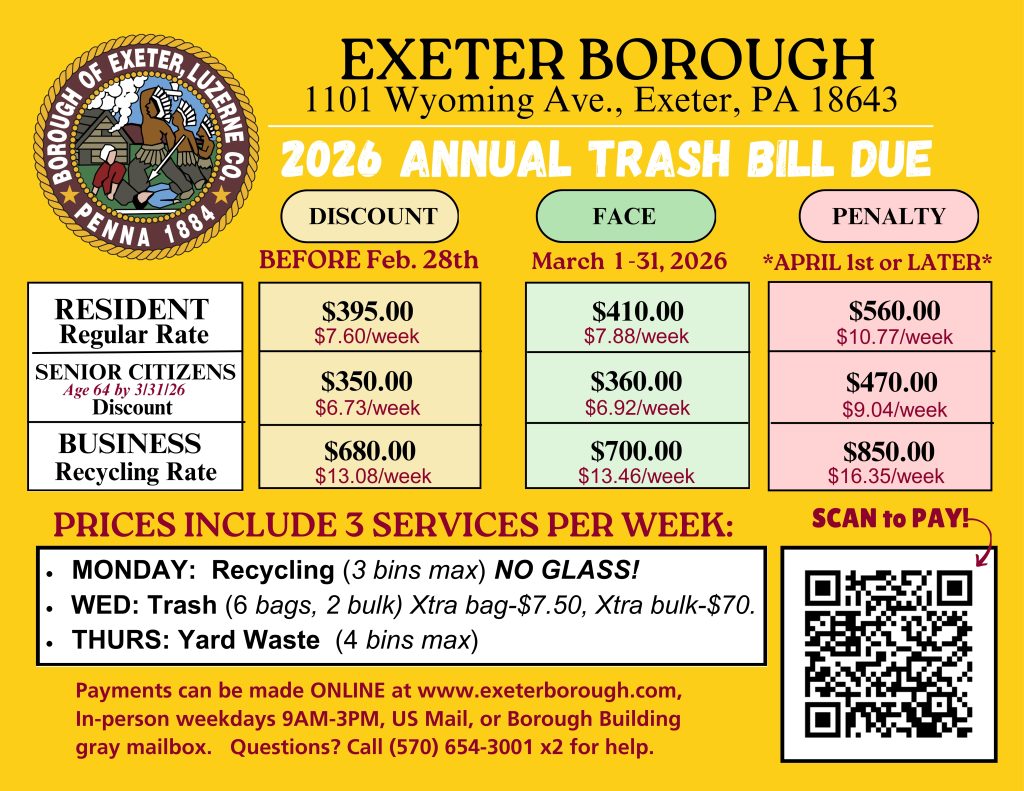 Refuse stickers may be picked up @ the Borough Building weekdays between 9:00am-3:00pm; OR mailed to: Exeter Borough, 1101 Wyoming Avenue, Exeter, PA 18643; OR dropped off in the gray mailbox outside our building; OR pay online.