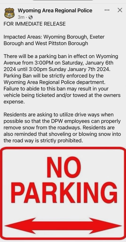 Wyoming Avenue Parking Ban – January 6 – 7, 2024